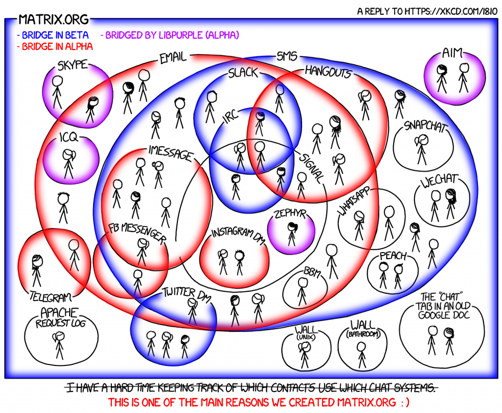 Alternatively, an existing Matrix room can be can plumbed into one or more specific remote rooms by configuring a bridge (which can be run by anyone). For instance, #matrix:matrix.org is plumbed into #matrix on Freenode, matrixdotorg/#matrix on Slack, etc. Access control for Matrix users is necessarily managed by the Matrix side of the room. This is useful for using Matrix to link together different communities.