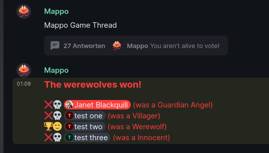 He's a lil noodly jellyfish fella that lets you play the eponymous social deduction game of Mappo where some people are villagers and some people are creatures. The village is trying to figure out who the creatures are to exile them, but at the same time, the creatures are slowly picking them off, one-by-one until they outnumber them! Who wins is determined by who's the best at deducing the truth (or obfuscating it if you're one of the creatures!) The roles range from the conventional like the Seer and Werewolf to the wild and wacky like Cookie Person and Goose.