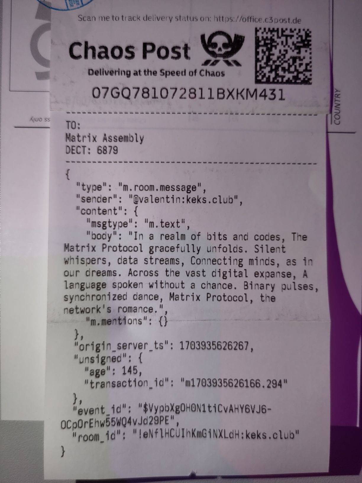 The 37th Chaos Communication Congress, sort of a school reunion of hackers, recently ended. From the 27th to the 30th of December 2023, a bunch of nerdy people met up in Hamburg (northern Germany) to discuss all the cool stuff they had been up to. Topics ranged as wide as technology, society, politics and even food hacking as well as a whole lot of other interesting things (talks can by the way be found at https://media.ccc.de/ and most are already uploaded, wow!). We had a Matrix Community Assembly there. An assembly is basically an area for like-minded people to meet up and talk about their topics, in this case Matrix.