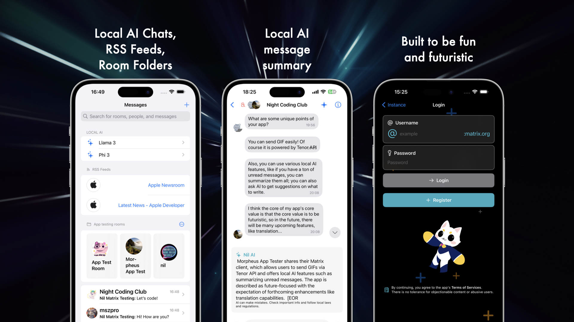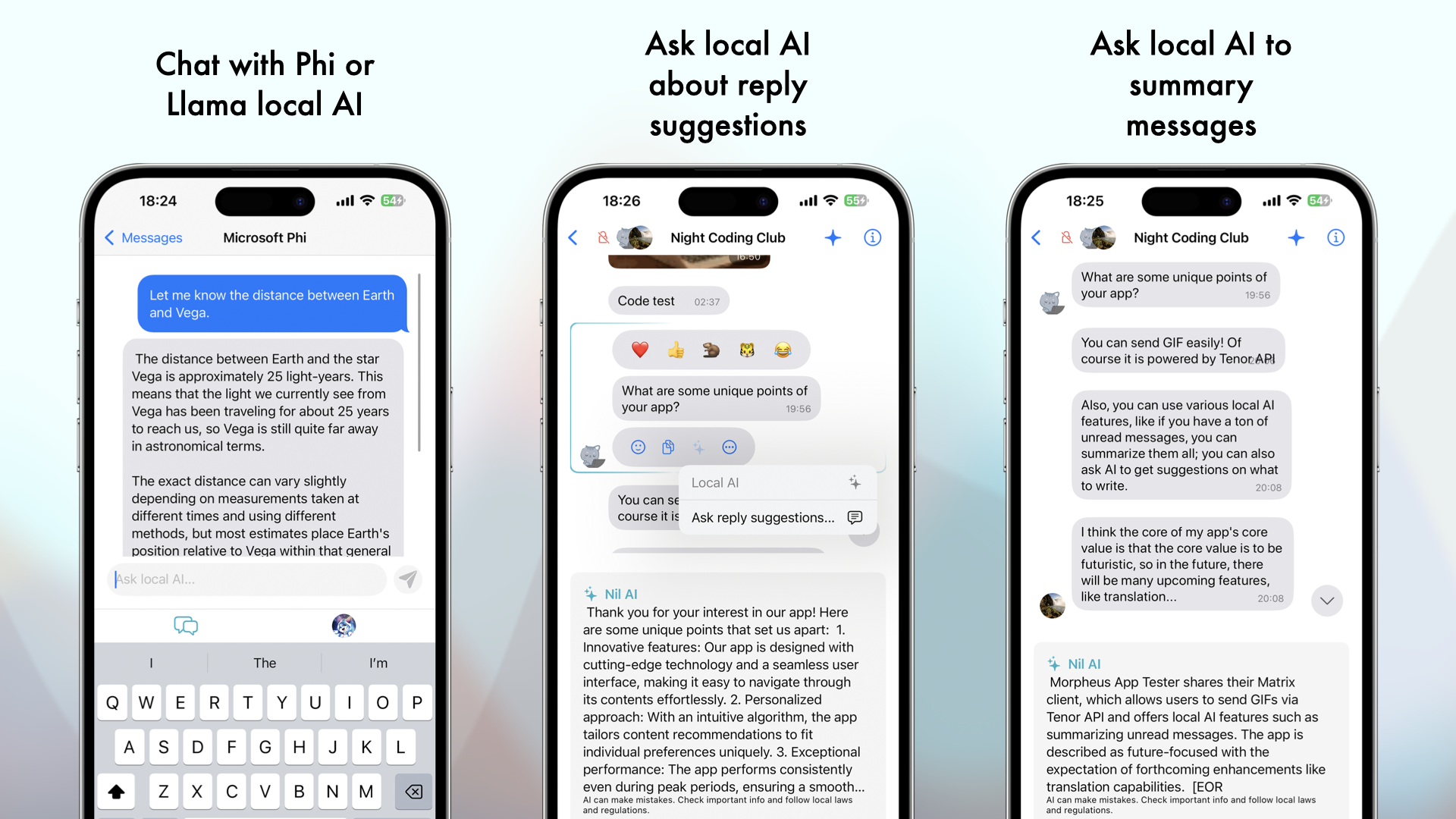 Plus, Nil allows you to download an AI model and run it locally on your device (currently supporting Microsoft Phi and Meta Llama 3). There is absolutely no online API calls, and you can casually chat with local AI, ask it to summarize latest messages within a group, or ask for reply suggestions for a specific message.
