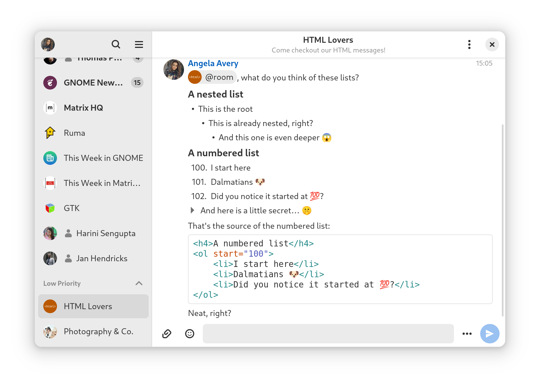 • Speaking of HTML rendering, code blocks gained syntax highlighting, lists can be nested, numbered lists can start from an arbitrary number, the details tag is supported, and @room mentions are detected and rendered with a pill