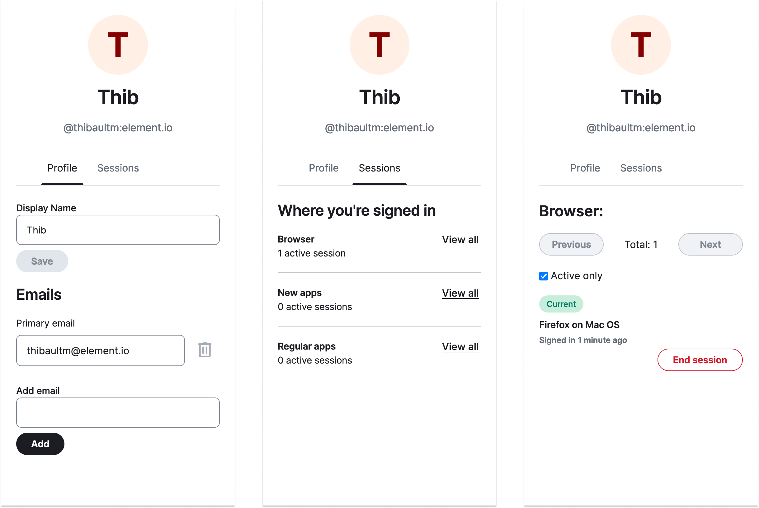 Element has been spearheading the effort to implement MSC3861 and matrix-authentication-service, and Element X is the first client to support them. Here is how the authentication flow and account management look like as seen from Element X iOS.